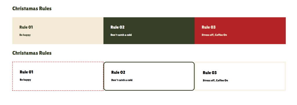 <!DOCTYPE html> <html lang="en"> <head> <meta charset="UTF-8"> <meta name="viewport" content="width=device-width, initial-scale=1.0"> <title>Tailwind CSS</title> <link rel="stylesheet" href="/src/output.css"> </head> <body> <div class="container mx-auto pt-8 font-lilita"> <h2 class="text-3xl text-drak-green mb-8">Christamas Rules</h2> <div class="flex flex-row"> <div class="basis-1/3 bg-eggshell p-10"> <h3 class="text-2xl text-drak-green mb-4">Rule 01</h3> <p class="text-base text-drak-green">Be happy</p> </div> <div class="basis-1/3 bg-drak-green p-10"> <h3 class="text-2xl text-white mb-4">Rule 02</h3> <p class="text-base text-white">Don't catch a cold</p> </div> <div class="basis-1/3 bg-brick-red p-10"> <h3 class="text-2xl text-eggshell mb-4">Rule 03</h3> <p class="text-base text-eggshell">Stress off, Coffee On</p> </div> </div> </div> <div class="container mx-auto pt-8 font-lilita"> <h2 class="text-3xl text-drak-green mb-8">Christamas Rules</h2> <div class="flex flex-row"> <div class="basis-1/3 p-10 border-2 border-brick-red border-dashed"> <h3 class="text-2xl mb-4">Rule 01</h3> <p class="text-base">Be happy</p> </div> <div class="basis-1/3 p-10 border-4 border-drak-green rounded-2xl"> <h3 class="text-2xl mb-4">Rule 02</h3> <p class="text-base">Don't catch a cold</p> </div> <div class="basis-1/3 p-10 border-6 border-eggshell border-double"> <h3 class="text-2xl mb-4">Rule 03</h3> <p class="text-base">Stress off, Coffee On</p> </div> </div> </div> </body> </html>
