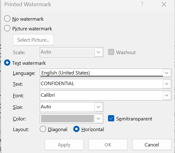 အကယ်၍ မိမိသည် စာသားအောက်ခံပုံထည့်ချင်တာမျိုး မဟုတ်ဘဲ စာသားသီးသန့် ထည့်ချင်ပါက Microsoft Word ဖိုင်ထဲက Watermark ကိုပဲ click ထပ်နှိပ်ပြီး Custom Watermark ကို click ကို နှိပ်ပါ။ ကျလာသော box တွင် စာသားထည့်ရန်အတွက် Text Watermark ကို click နှိပ်ပြီး Text စာသားများကို ပြောင်းချင်ပါက ပြောင်းရေးနိုင်သလို font & size များကိုပါ မိမိတို့ လိုအပ်သလို ပြောင်းလဲရေးသားလို့ ရပါတယ်။ ရေးပြီးပါက OK လုပ်ပါ။ အောက်ပါအတိုင်း ပုံတွင်ပြပေးထားပါတယ်။